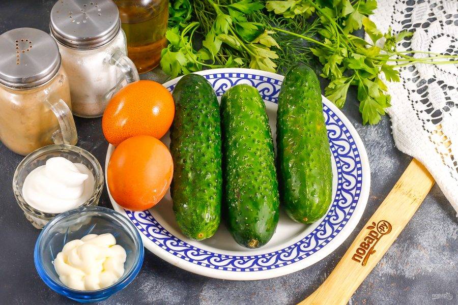 Подготовьте указанные ингредиенты. Куриные яйца отварите заранее в течение 15 минут и остудите в ледяной воде.