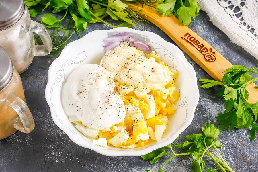 В это время очистите отварные куриные яйца от скорлупы и промойте в воде, нарежьте мелким кубиком и смешайте яичную нарезку со сметаной, солью, майонезом и молотым черным перцем в небольшой емкости, пиале.