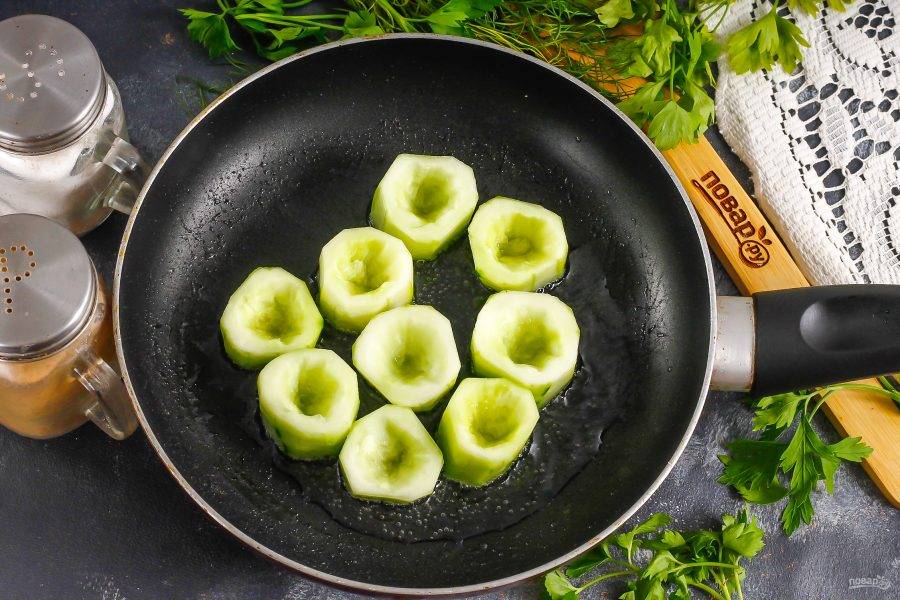 Затем обсушите бумажным полотенцем корзинки из огурцов и обжарьте их в растительном масле на сковороде с обеих сторон по 2-3 минуты до румяности.
