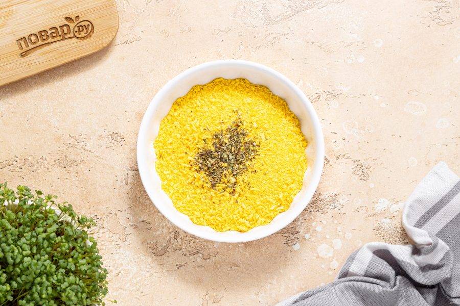 В небольшой глубокой миске смешайте панировочные сухари с сушеными итальянскими травами.