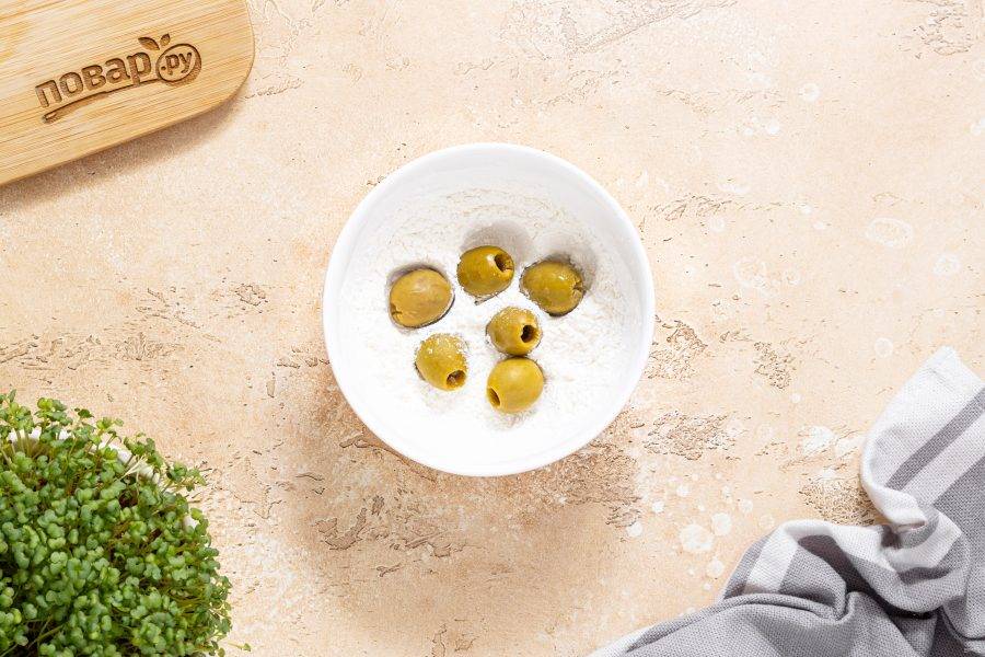 Обваляйте оливки в смеси крахмала с мукой.