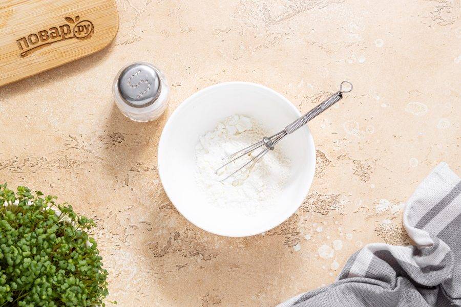 Смешайте муку, кукурузный крахмал и щепотку соли.