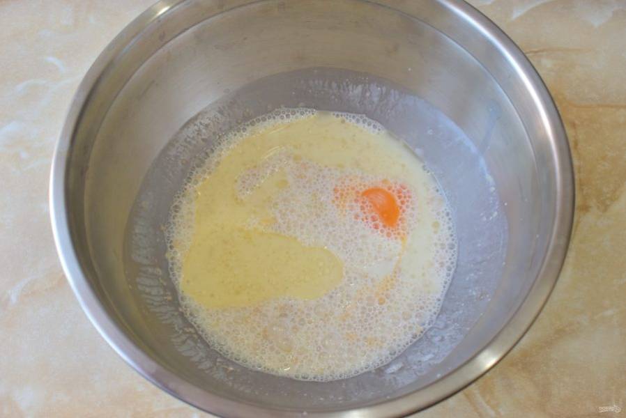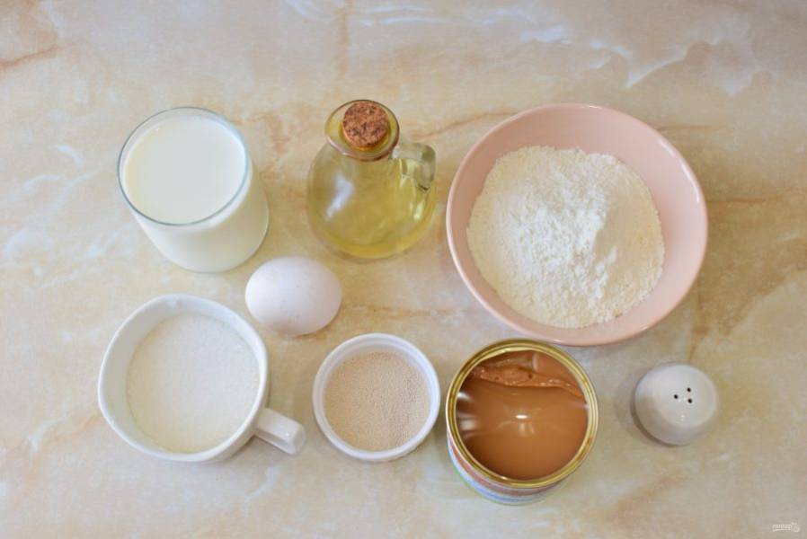 В миску налейте теплое молоко и добавьте сахар, соль и сухие дрожжи. Смешайте.