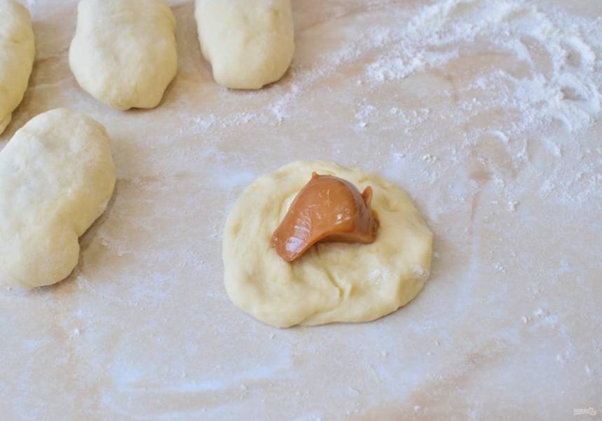 Нарежьте тесто на кусочки. Из каждого кусочка сформируйте лепешку и выложите начинку. Защипите края и сформируйте пирожок. Пирожкам дайте немного полежать на столе. Пока вы налепите последние пирожки, первые уже можно начинать жарить.