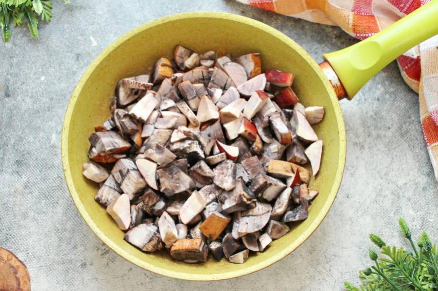 Грибы порежьте дольками и выложите в сковороду. Добавьте 2 столовые ложки растительного масла и поставьте на средний огонь.