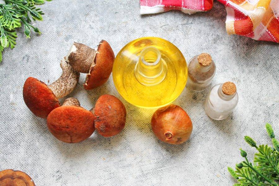 Подготовьте все необходимые ингредиенты для приготовления жареных подосиновиков. Репчатый лук почистите и сполосните.