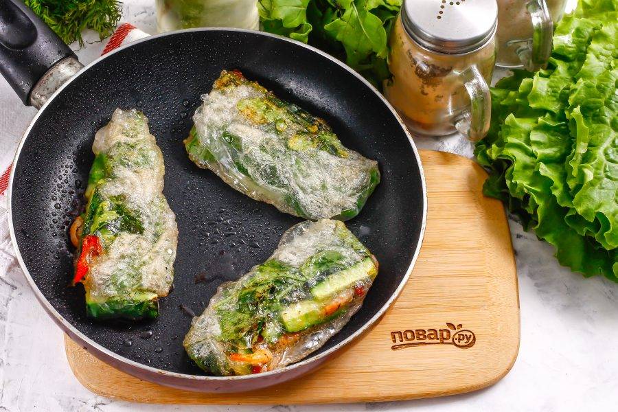 Обжарьте спринг-роллы около 1-2 минут до румяности и переверните на другую сторону, обжарьте такое же количество времени.