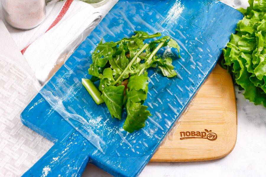 Нарежьте несколько слайсов перца чили, но без семян. Выложите на креветки вместе с рукколой.