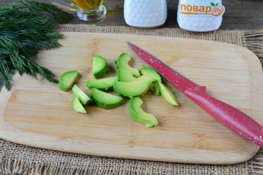 Мякоть авокадо достаньте при помощи ложки и нарежьте полосками.