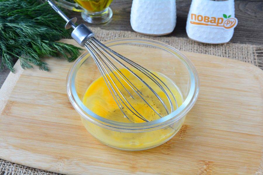 Куриные яйца вбейте в отдельную емкость, добавьте соль и черный перец по вкусу, взболтайте.