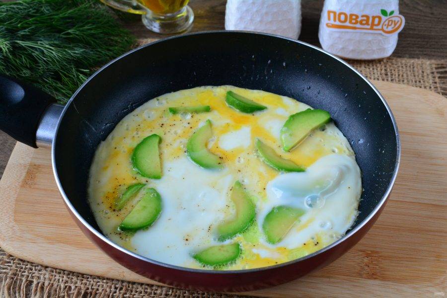 Обжаривайте авокадо с яйцом 2-3 минуты на небольшом огне под крышкой.