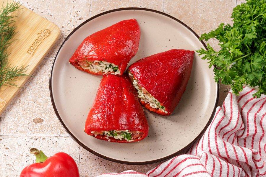 Наполните перцы начинкой, не очень плотно, чтобы она не вытекала при обжаривании. Слегка прижмите перцы ладонью.