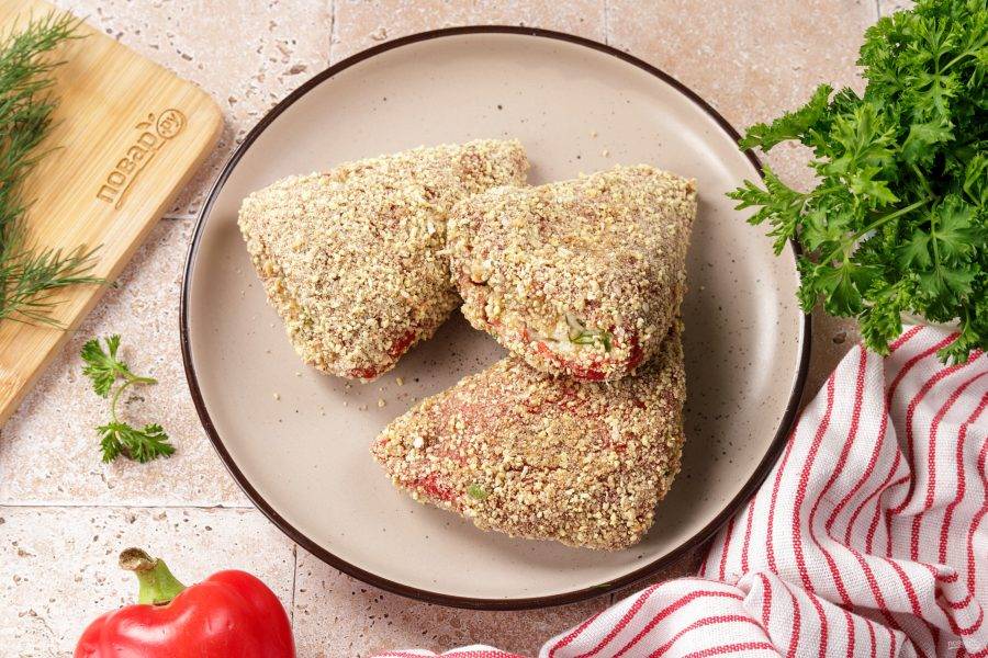 Окуните перец во взбитое яйцо, а затем обваляйте в сухарях.