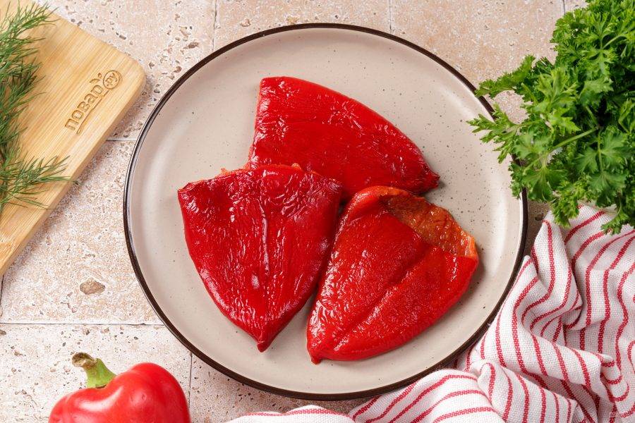 У перцев удалите плодоножку, семена и перегородки. Промойте, обсушите, смажьте растительным маслом и выложите в жаропрочную форму. Запекать перец при температуре 190 градусов 10 минут с одной стороны, затем аккуратно перевернуть и запекать столько же с другой стороны.