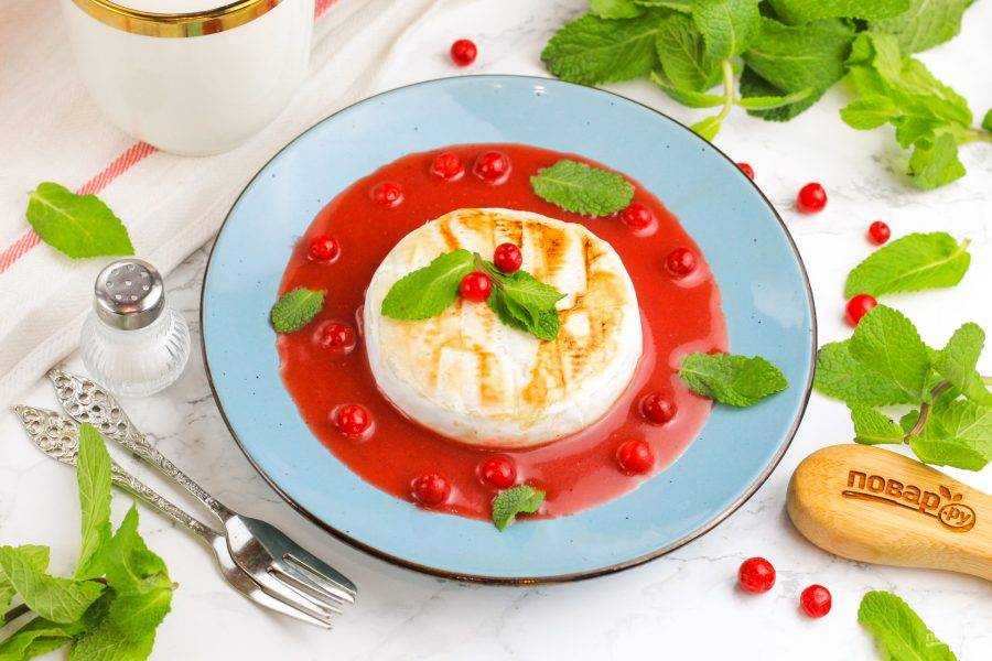 Распределите брусничный соус по тарелке и выложите в него жареный камамбер. Либо выложите сыр на тарелку и полейте его соусом, украсьте листочками свежей мяты. Приятного вам аппетита!