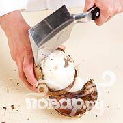 Разбить кокос. Слить кокосовое молоко в кастрюльку. Нарезать белую часть на небольшие кубики.
