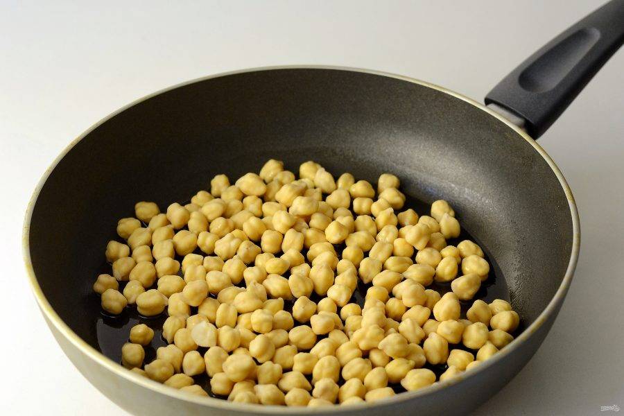 Разогрейте сковороду на среднем огне. Обжарьте нут с маслом, периодически помешивая. Это займет примерно 15-20 минут.