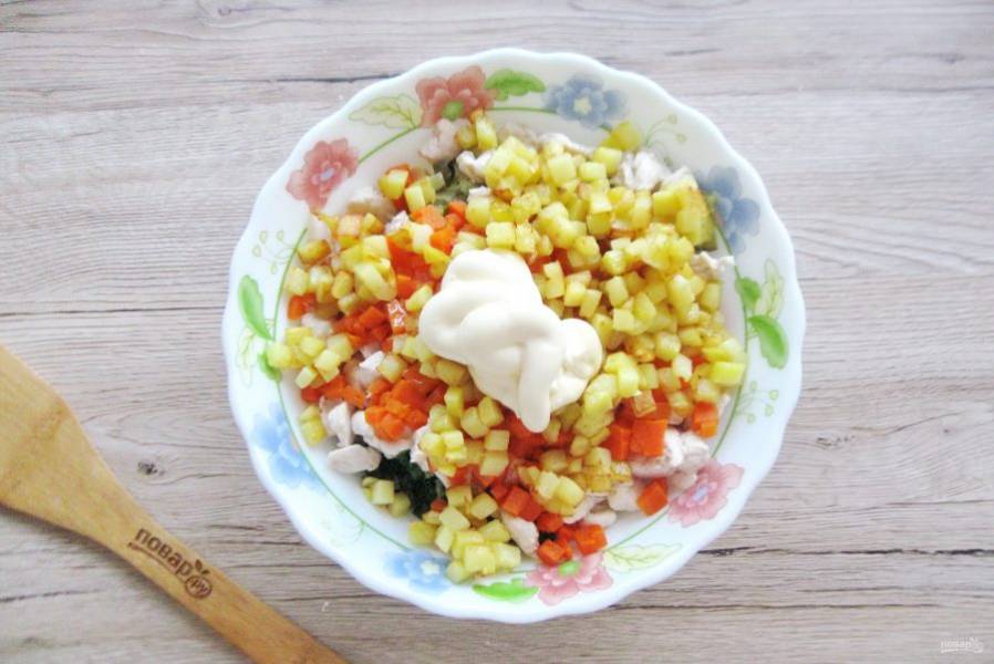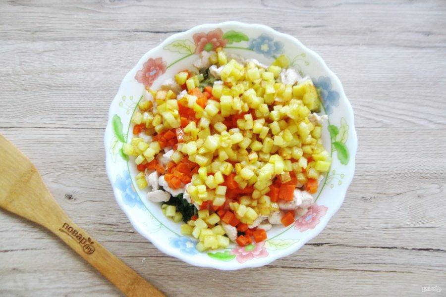 Морковь отварите до мягкости, очистите, мелко нарежьте и выложите в салатник.