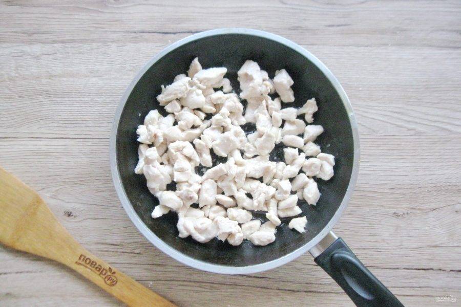 Куриное филе мелко нарежьте и выложите в сковороду с маслом. Перемешивая, поджарьте до готовности.