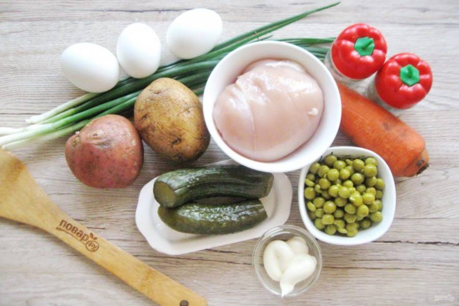 Подготовьте ингредиенты для приготовления салата "Оливье".