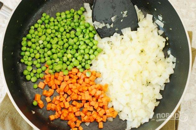 Лук и морковь нарежьте кубиком, отправьте на разогретую сковороду с маслом. Через 2-3 минуты, когда лук станет мягким, отправьте к овощам горох.