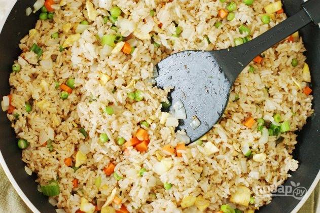 Перемешайте и обжаривайте рис в течение как минимум 3 минут до тех пор, пока приправы и рис не будут хорошо скомбинированы. В конце готовки добавьте порезанный яичный блинчик и подавайте к столу. Приятного аппетита!