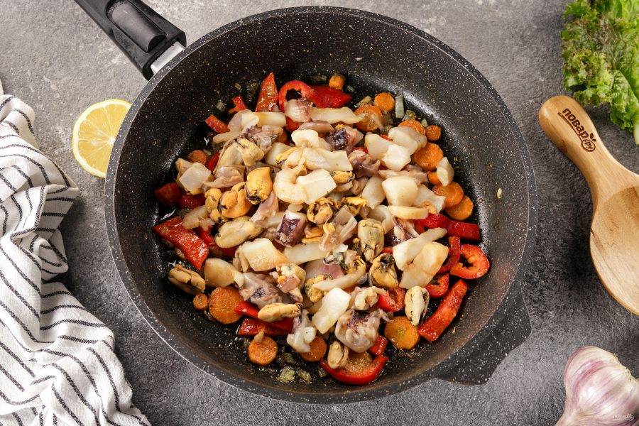 Жарьте до готовности (в зависимости от особенностей вашей плиты, выбранной сковороды и количества жидкости в морепродуктах, время жарки варьируется от 5 до 10 минут). Даже если ваш коктейль содержит кальмары, которые готовятся 2 минуты, время готовки не уменьшайте, кальмары жесткими не будут.