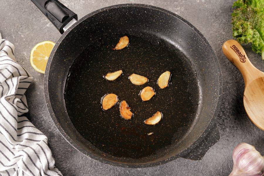 На разогретую сковороду с маслом выложите нарезанный пластинами чеснок.