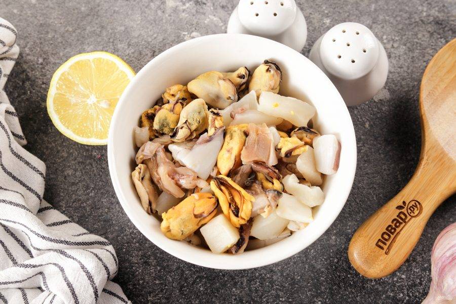 Морской коктейль разморозьте, слейте всю выделившуюся жидкость.