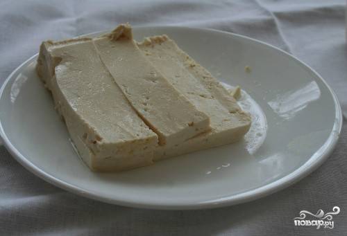 1. Выкладываем сыр на тарелку, ставим на него небольшой пресс, чтобы ушла лишняя жидкость. Через 20-30 минут сливаем воду и нарезаем на длинные кусочки (можно любой формы).