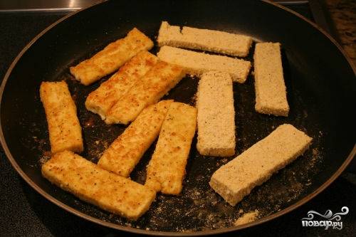 3. Сковороду ставим на огонь, наливаем масло и обжариваем сыр в панировке с каждой стороны до появления румяной корочки. Готовые сырные палочки выкладываем на бумажное полотенце, чтобы ушел лишний жир.