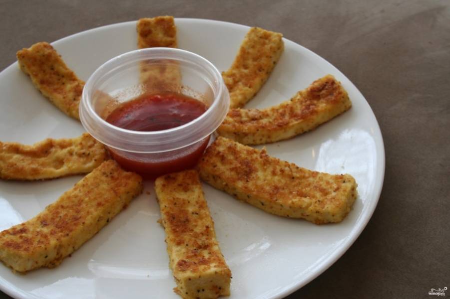 4. Обжаренные палочки тофу подаем с кетчупом или любым другим соусом, по желанию. Приятного аппетита!