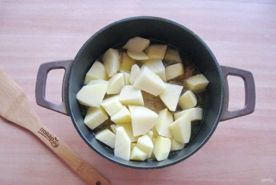 Картофель очистите, помойте и нарежьте не очень мелко. Выложите в казан с курицей.