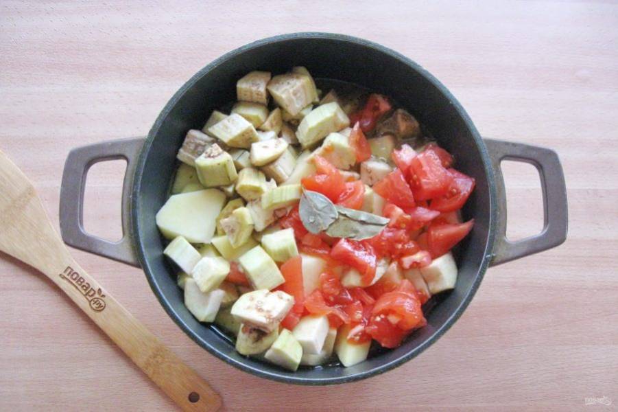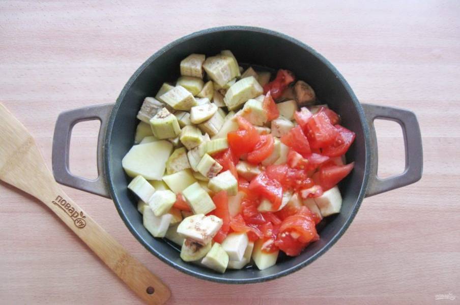 Баклажаны помойте, очистите. Помидор обдайте кипятком, снимите шкурку. Нарежьте кубиками баклажан и помидор.