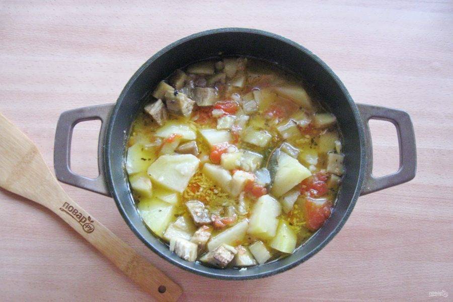 Тушите курицу с овощами до готовности еще 20-25 минут. В конце добавьте измельченный чеснок.