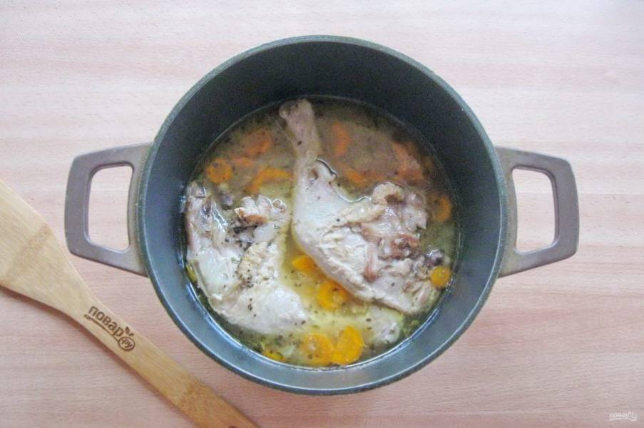 Тушите курицу с морковью и луком почти до готовности. Посолите и поперчите.