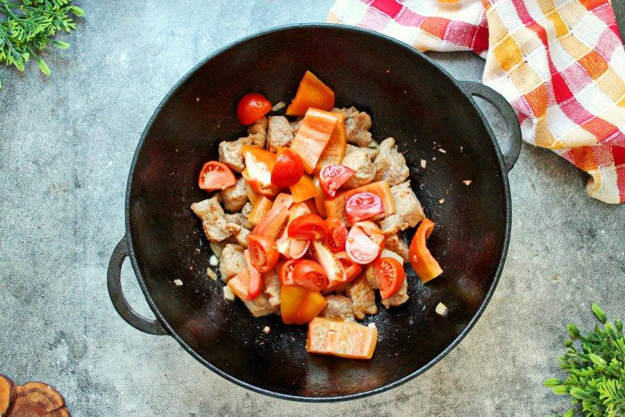 Помидоры разрежьте на крупные части и добавьте в казан. Готовьте, не мешая в течение 6 минут под крышкой.