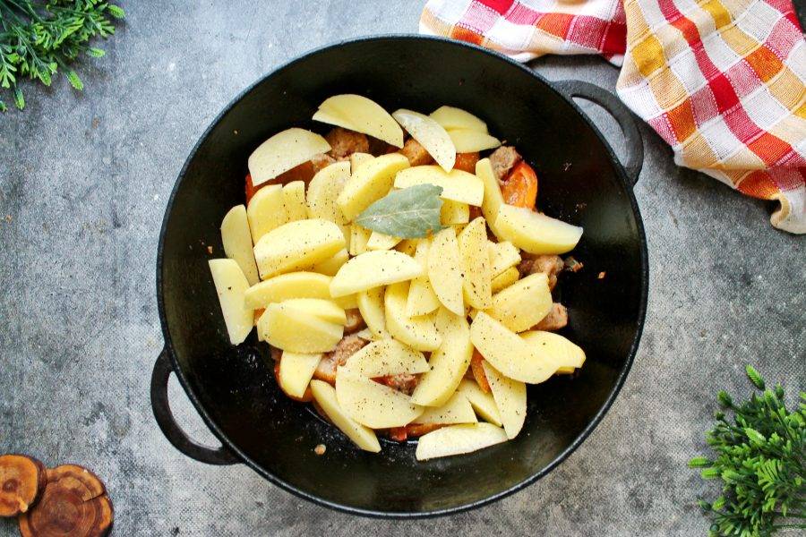 Картофель порежьте средними дольками и выложите к свинине с овощами.