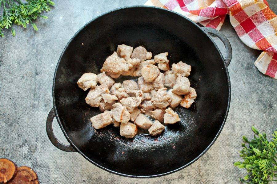 Свинину сполосните, обсушите бумажным полотенцем и порежьте средним кубиком. В казан или сковороду с толстым дном поставьте на сильный огонь. Влейте растительное масло и разогрейте. Выложите свинину и обжаривайте на сильном огне в течение 5 минут, перемешивая.