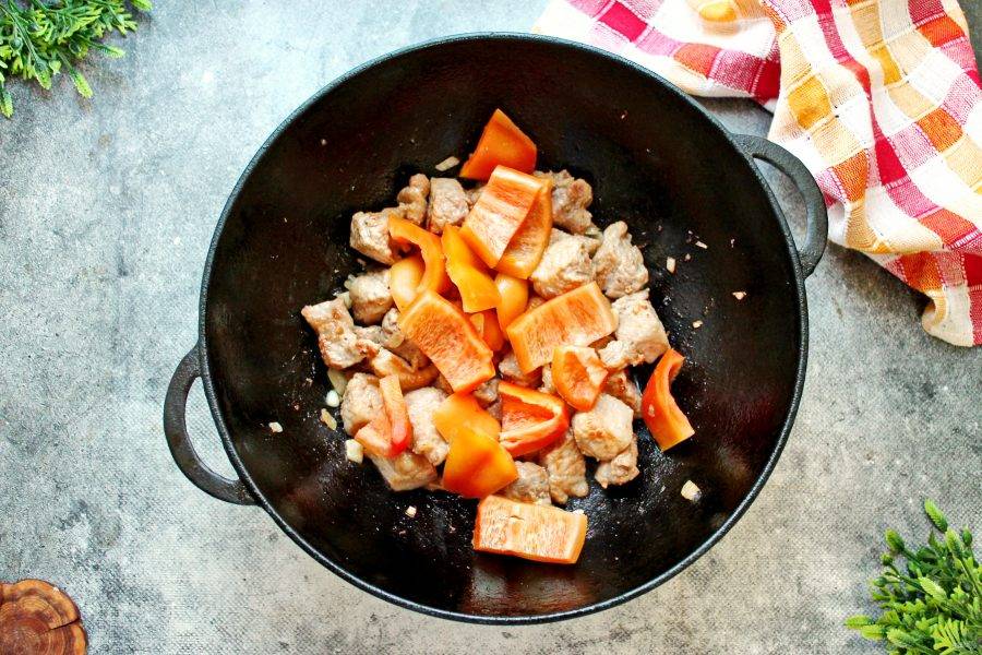 Болгарский перец почистите от плодоножки и семян, крупно порежьте и выложите к мясу с овощами.