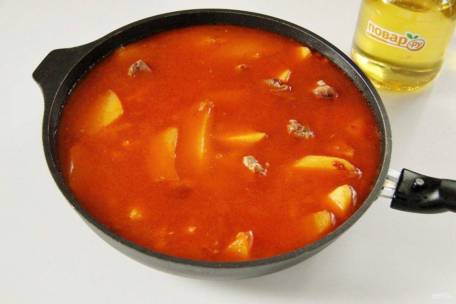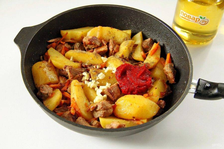 Добавьте томатную пасту, измельченный ножом чеснок, соль, перец или другие любимые специи.