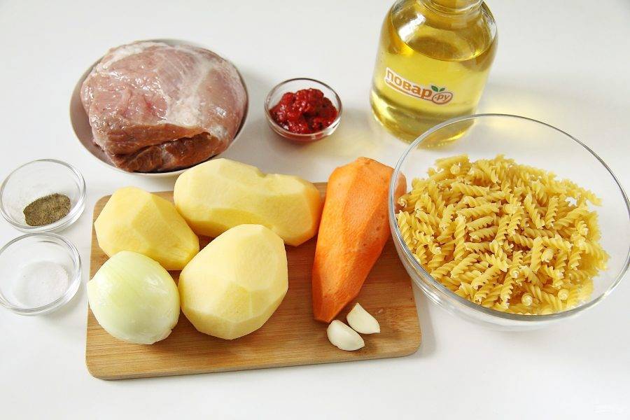 Интересный вариант жаркое с мясом, овощами и макаронами. В результате получается очень вкусное и питательное блюдо. Подойдет для сытного обеда или ужина в кругу семьи.