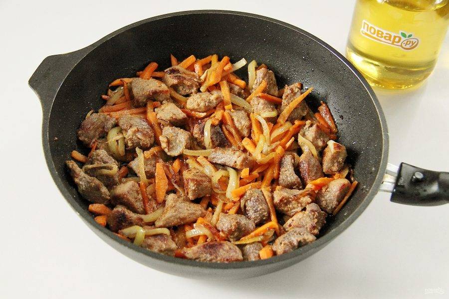 Затем добавьте нарезанную соломкой морковь и продолжайте обжаривать мясо с овощами еще 5-7 минут.