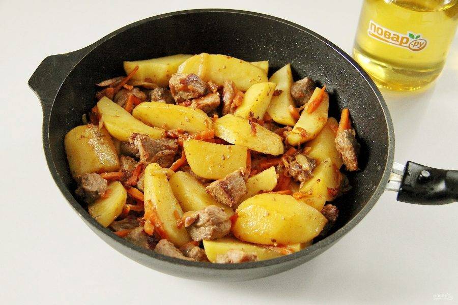 Добавьте крупно нарезанный картофель и обжарьте его до полуготовности.