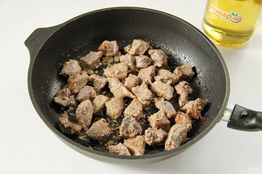 Налейте в сковороду масло и положите нарезанное небольшими кусочками мясо.