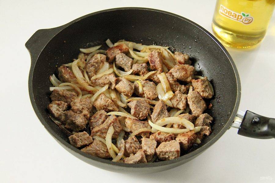 Мясо посолите и обжарьте на среднем огне до испарения жидкости и появления легкой румяной корочки сверху.