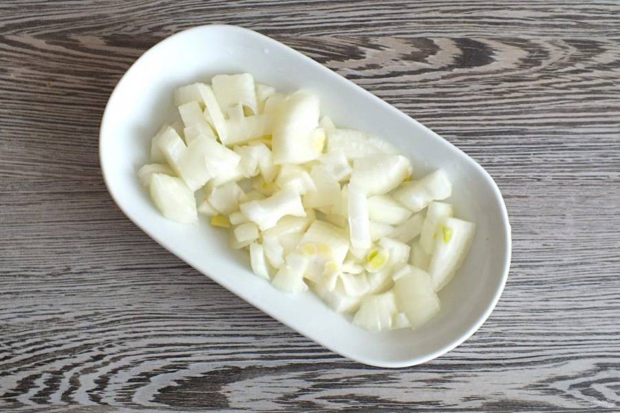 Лук нарежьте на кусочки в пределах 1 см.