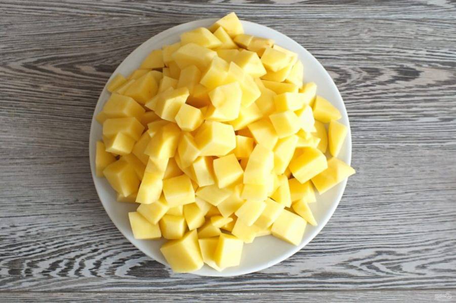 Картофель нарежьте на кусочки в пределах 2 см.