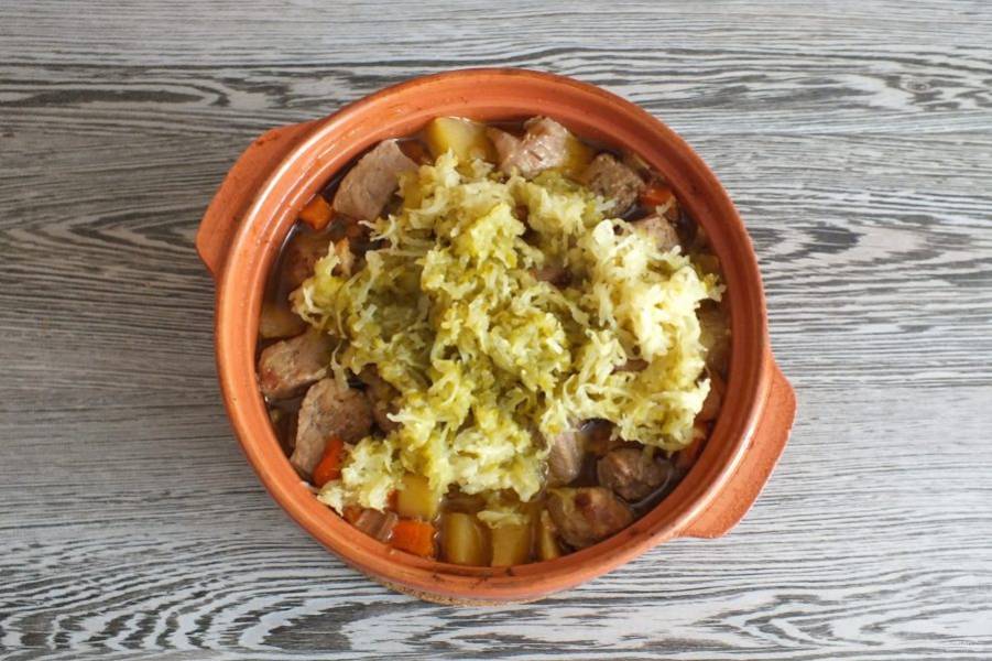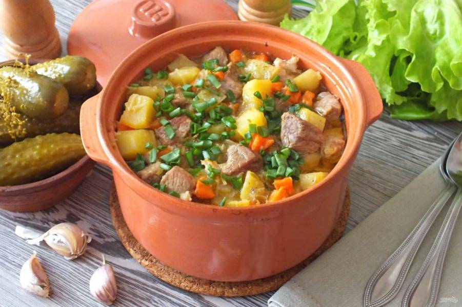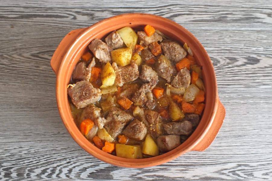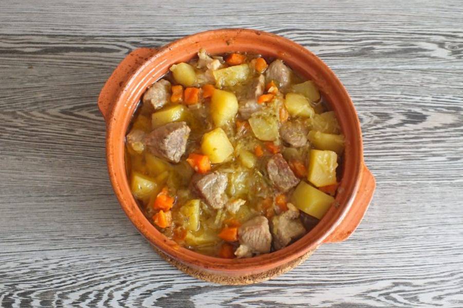 Через указанное время достаньте горшочек, перемешайте содержимое. Жаркое готово к подаче.