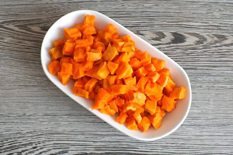 Морковь нашинкуйте на кусочки в пределах 1 см.